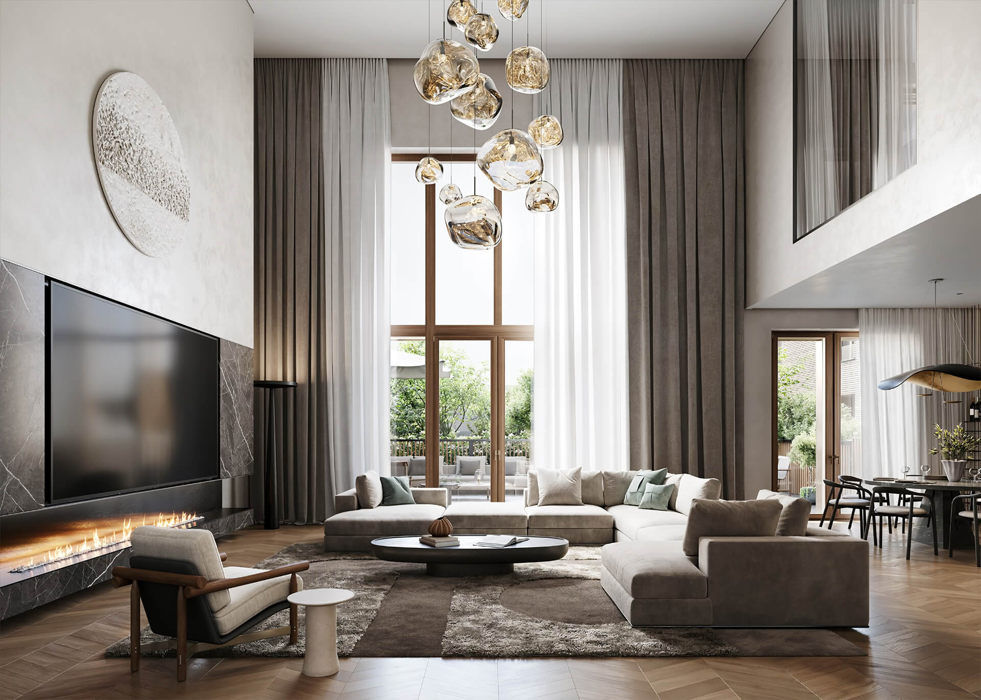 Большие гостиные с зонами второго света создают ощущение невероятного простора, а мастер-спальни оборудованы собственными гардеробными и ванными комнатами. В квартирах предусмотрены удобные ниши для встроенных систем хранения, а свободные планировки позволяют реализовать любые дизайнерские решения. Панорамное остекление делает пространство светлым и воздушным, создавая ощущение легкости и гармонии с окружающей архитектурной средой.