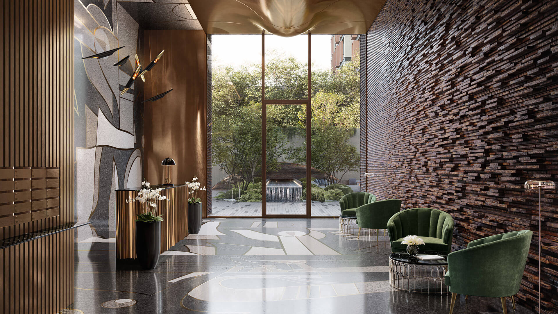 Вестибюль выполнен в концепции открытого пространства: сквозная планировка обеспечивает проникновение естественного света, а использование дорогостоящих материалов придает интерьеру благородство и изысканность. Зона ресепшн оборудована системой интеллектуального контроля доступа, обеспечивая безопасность и приватность для резидентов. Консьерж-служба, работающая круглосуточно, предлагает широкий спектр услуг, делая проживание в комплексе еще более удобным и комфортным.