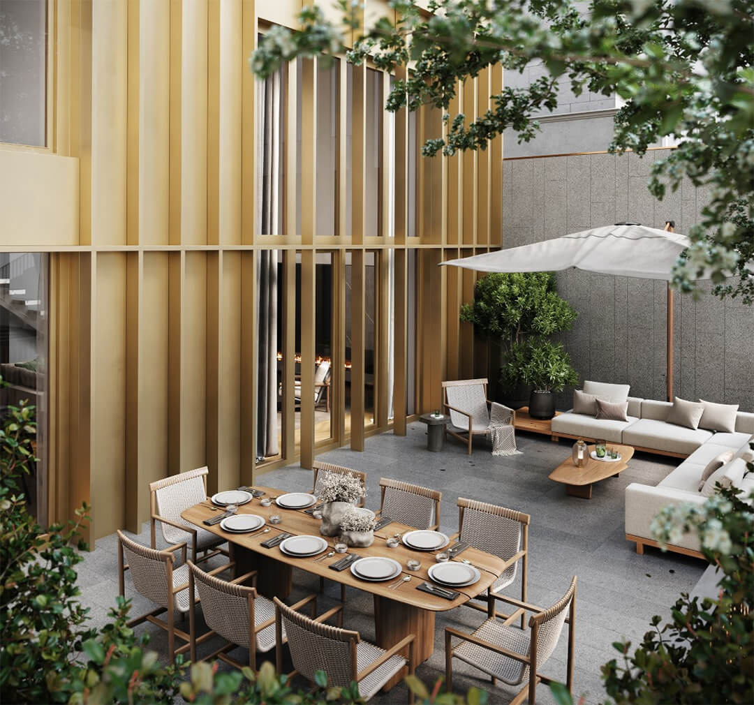 Пешеходные дорожки выложены натуральным камнем, а зона отдыха оборудована стильной дизайнерской мебелью, создающей атмосферу уюта и комфорта. Особое внимание уделено озеленению: ландшафтные дизайнеры подобрали породы деревьев и кустарников, которые будут радовать жителей круглый год. В вечернее время мягкое архитектурное освещение создает волшебную атмосферу уединенного сада. Территория двора закрыта от посторонних и охраняется круглосуточно, что создает ощущение защищенности и абсолютной приватности для жителей.